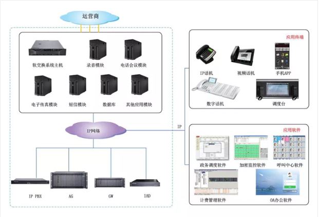 根據(jù)客戶需求結(jié)合以往的工作經(jīng)驗(yàn),本方案以實(shí)現(xiàn)VPN內(nèi)部通信電話功能為基礎(chǔ),結(jié)合 IP 網(wǎng)絡(luò)發(fā)展為業(yè)務(wù)核心,以一體化、智能化、便捷化管理為設(shè)計(jì)理念,綜合 IP 網(wǎng)絡(luò)、軟交換系統(tǒng)、WEB管理等多個(gè)應(yīng)用模塊,實(shí)現(xiàn)融合通信應(yīng)用。為結(jié)合網(wǎng)絡(luò)化擴(kuò)展本系統(tǒng)采用 SOC1000 軟交換為系統(tǒng)核心交換,與中繼系統(tǒng)IP話機(jī)+申甌IAD配合組網(wǎng)。