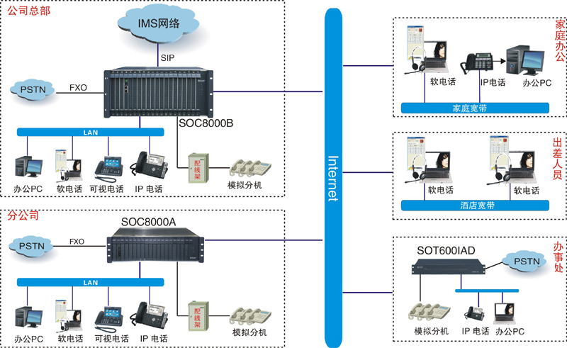 ? 公司總部:在總部機(jī)房部署一臺(tái)SOC8000IPPBX,單機(jī)最大容量為1536線,通過SIP協(xié)議注冊(cè)到移動(dòng)IMS平臺(tái);同時(shí)提供E1/FXO接口與企業(yè)原電信運(yùn)營商連接;通過以太網(wǎng)口接入Internet局域網(wǎng);