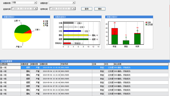 當(dāng)下各類傳感器已經(jīng)進入我們的生活,很多環(huán)境的檢測告警都已通過傳感器實現(xiàn),申甌校園智控“云”系統(tǒng)融合了各類傳感器,如煙感、紅外、過壓、過流、過溫、漏電等等??刹渴鹪趯W(xué)校的教學(xué)樓、宿舍樓、機房等。一旦觸發(fā)告警,我們的告警平臺(下圖所示)會“自動彈窗告警”,告警彈出窗口會顯示哪個時間、什么地點、發(fā)生了什么類型的告警,通過系統(tǒng)的多維度圖表分析,我們可分析告警的占比情況,如告警嚴重性等級、告警類型分類、告警地點。并且報警會觸發(fā)我們預(yù)先設(shè)置好的報警終端話機,接聽后會自動重復(fù)播報發(fā)生報警的地址位置。通過此系統(tǒng),我們能將預(yù)防做到前面、將危險控制在萌芽階段。