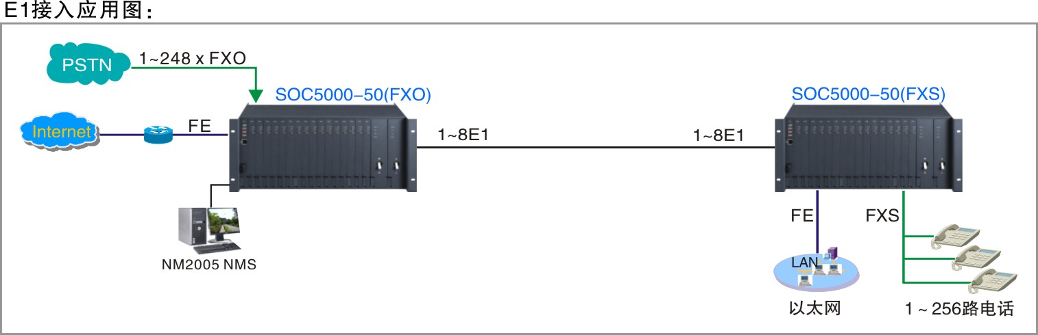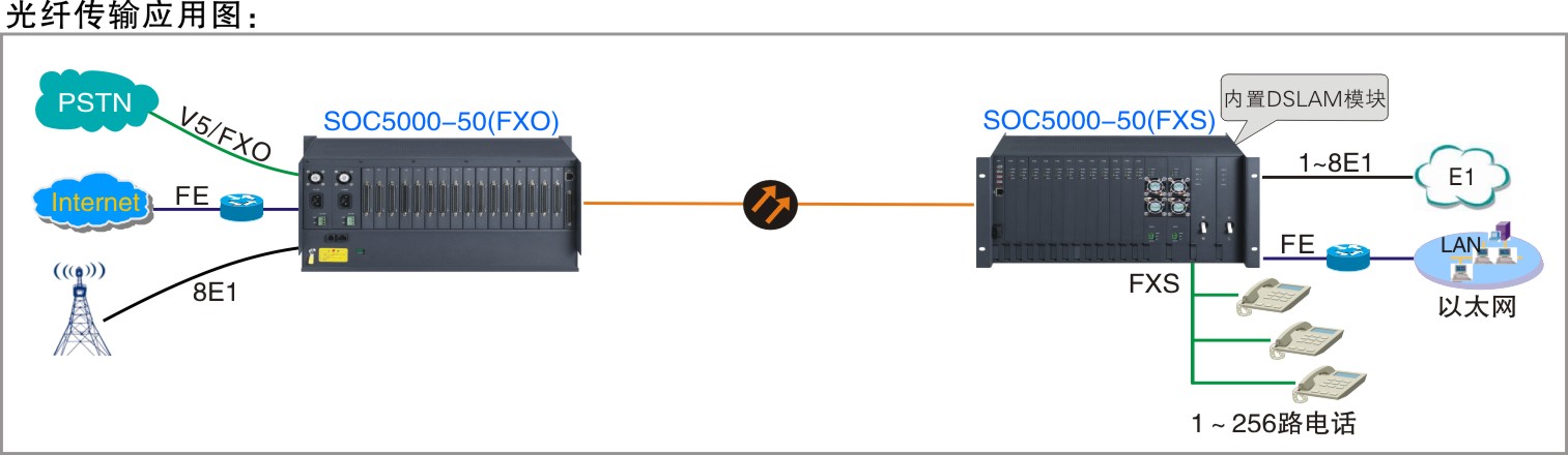SOC5000-50是根據(jù)當(dāng)前客戶對(duì)接入方式與業(yè)務(wù)需求多樣化而研發(fā)的綜合接入設(shè)備,主要用于語(yǔ)音、數(shù)據(jù)通信網(wǎng)絡(luò)中的各種業(yè)務(wù)接入、復(fù)用、傳輸。設(shè)備采用19英寸5U標(biāo)準(zhǔn)機(jī)箱,19槽插卡式結(jié)構(gòu)設(shè)計(jì)。集成PDH/SDH/E1/V5等多種線路接口,支持FXO/FXS/DSL/E1/數(shù)據(jù)盤等各種業(yè)務(wù)盤卡的大容量業(yè)務(wù)接入以及混插技術(shù),充分體現(xiàn)其靈活和兼容性,為客戶在原有傳輸構(gòu)架上提供性價(jià)比更高的傳輸接入方案,特別適用于“光進(jìn)銅退”工程綜合業(yè)務(wù)接入。此系列產(chǎn)品也能起到多通道保護(hù),當(dāng)設(shè)備選擇E1通道傳輸?shù)臅r(shí)候,任意1個(gè)E1可以傳輸128路語(yǔ)音,節(jié)約E1資源;還可起到“1+7通道保護(hù)”的功能,并且切換期間能保持話路通暢;同時(shí)起到保密跟線路檢測(cè)的功能。其廣泛應(yīng)用于各運(yùn)營(yíng)商、廣電網(wǎng)和公安、部隊(duì)(保密)、電力、鐵路、公路、交通、金融、政府及具有分支機(jī)構(gòu)的企事業(yè)單位專網(wǎng)。